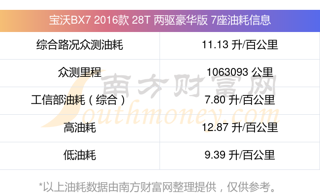 根据多位车主实测得出数据,该车型低油耗为9.39升每百公里,高油耗为12.87升每百公里,综合路况众测油耗为11.13升每百公里,工信部综合油耗为7.80升每百公里。