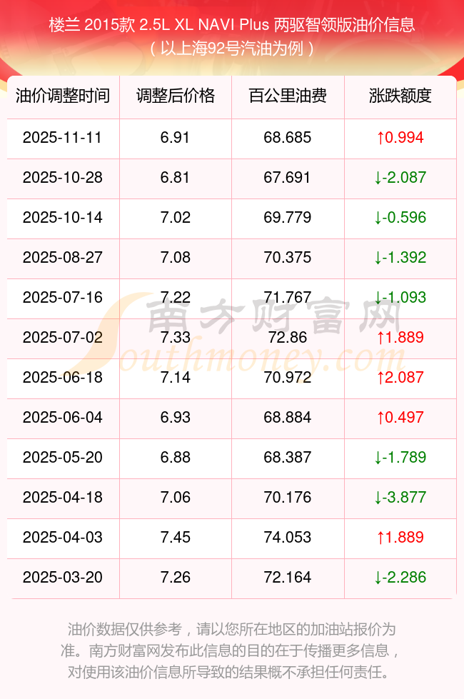 依照11月11日92号汽油最新调整价格6.91元/升来计算(以上海为例),该车型百公里的平均油费是68.685元,依照上一轮10月28日调整价格6.81元/升来计算,百公里的平均油费是67.691元,对比上一轮多花0.994元,下一轮的油价调整时间11月24日24时。
