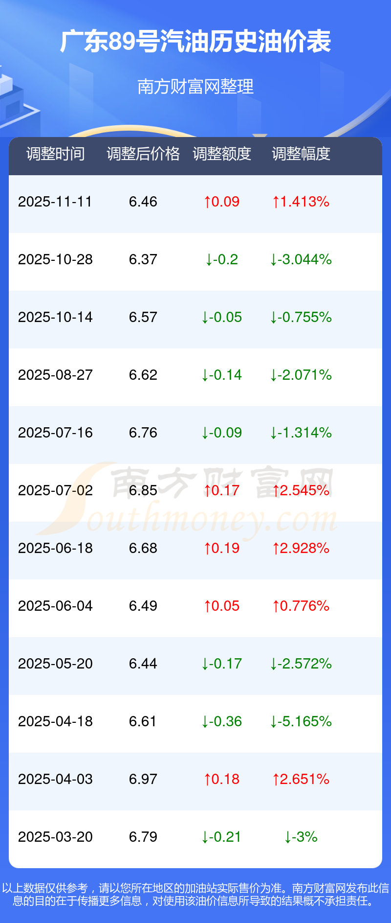 11月17日,广东89号汽油的价格是6.46元每升,本次的调整时间为11月11日,对比上次的调整上涨了0.09元,上涨1.413%,下次调整时间为11月24日24时,还有7.71天。
