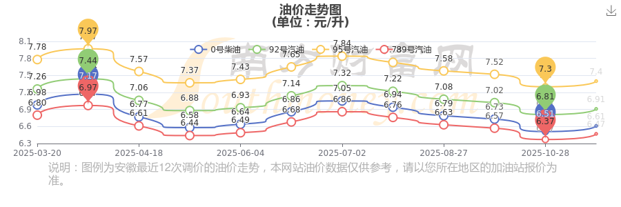 安徽蚌埠95号汽油11月17日价格查询:11月11日油价调整后,安徽蚌埠95号汽油7.4元/升,相对上次调整时间10月28日的油价7.3元每升,上涨了0.1元,上涨1.37%。下一轮油价调整时间11月24日24时,距离现在还有7.63天。