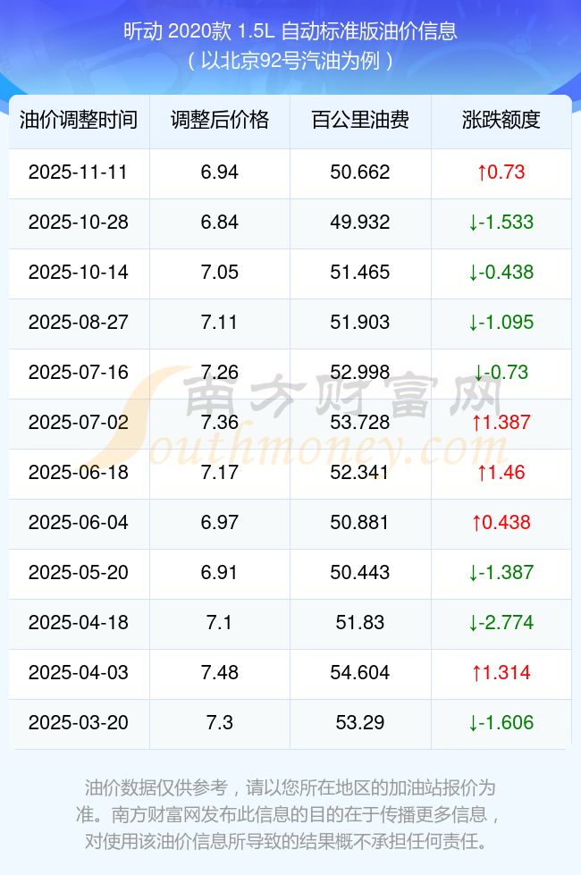 依照11月11日92号汽油最新调整价格6.94元/升来计算(以北京为例),该车型百公里的平均油费是50.662元,依照上一轮10月28日调整价格6.84元/升来计算,百公里的平均油费是49.932元,对比上一轮多花0.73元,下一轮的油价调整时间11月24日24时。