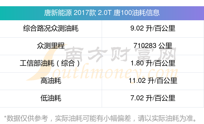 根据多位车主实测得出数据,该车型低油耗为7.02升/百公里,高油耗为11.02升/百公里,综合路况众测油耗为9.02升/百公里,工信部综合油耗为1.80升/百公里。
