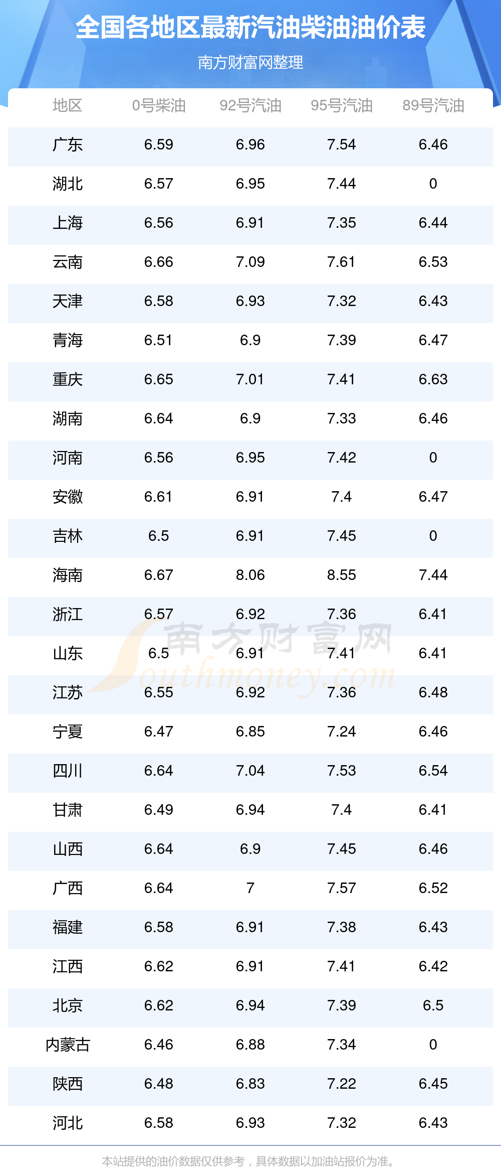 全国0号柴油平均价格为:7元每升,其中,最低为内蒙古,价格6.46元/升,最高为海南,价格6.67元/升。