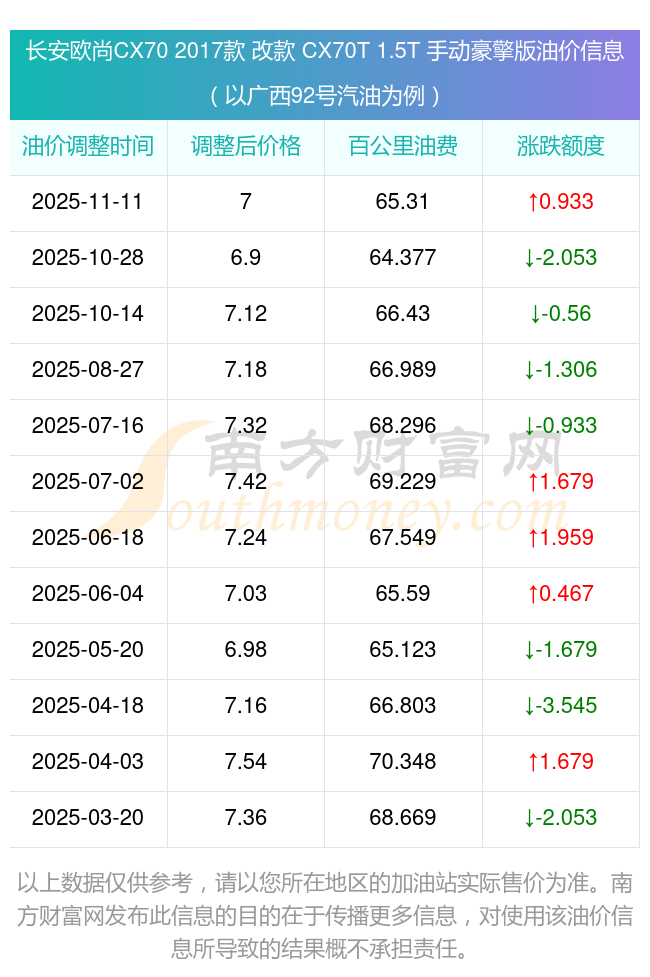 按照11月11日92号汽油最新调整价格7元/升来计算(以广西为例),该车型百公里平均油费为65.31元,按照上一轮10月28日调整价格6.9元/升来计算,百公里平均油费为64.377元,对比上一轮多花0.933元,下一轮油价调整时间为11月24日24时。