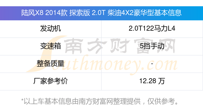 在动力方面,陆风X8 2014款 探索版 2.0T 柴油4X2豪华型搭载的是一台2.0T122马力L4涡轮增压发动机,匹配5挡手动挡变速箱,燃料形式为柴油,厂家参考价12.28万元。