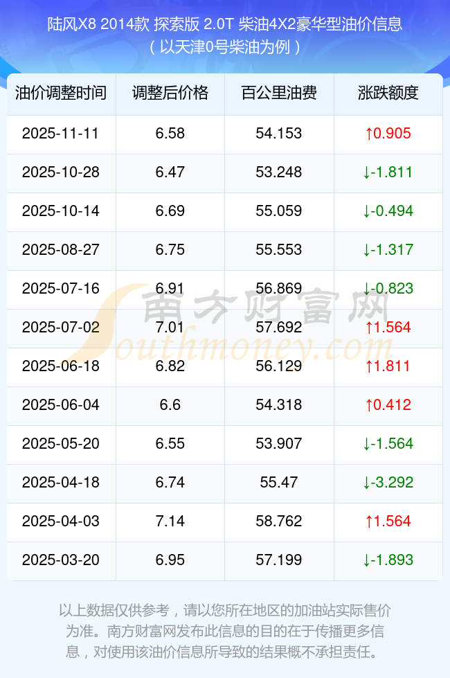 按照11月11日0号柴油最新调整价格6.58元/升来计算(以天津为例),该车型百公里平均油费为54.153元,按照上一轮10月28日调整价格6.47元/升来计算,百公里平均油费为53.248元,对比上一轮多花0.905元,下一轮油价调整时间为11月24日24时。