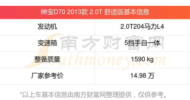 在动力方面,绅宝D70 2013款 2.0T 舒适版搭载的是一台2.0T204马力L4涡轮增压发动机,匹配5挡手自一体自动档变速箱,燃料形式为汽油,常规整备质量1590kg,厂家参考价14.98万元。