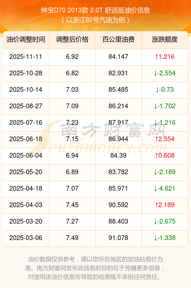 按11月11日92号汽油最新调整价格6.92元每升来计算(以浙江为例),该车型百公里平均油费为84.147元,按上一轮10月28日调整价格6.82元每升来计算,百公里平均油费为82.931元,对比上一轮多花1.216元,下一轮油价调整时间为11月24日24时。