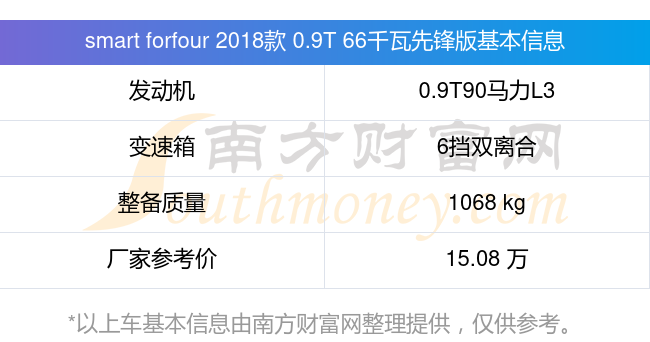 smart forfour 2018款 0.9T 66千瓦先锋版动力上搭载的是一台0.9T90马力L3涡轮增压发动机,匹配6挡双离合自动档变速箱,燃料形式为汽油,常规整备质量1068kg,厂家参考价15.08万元。