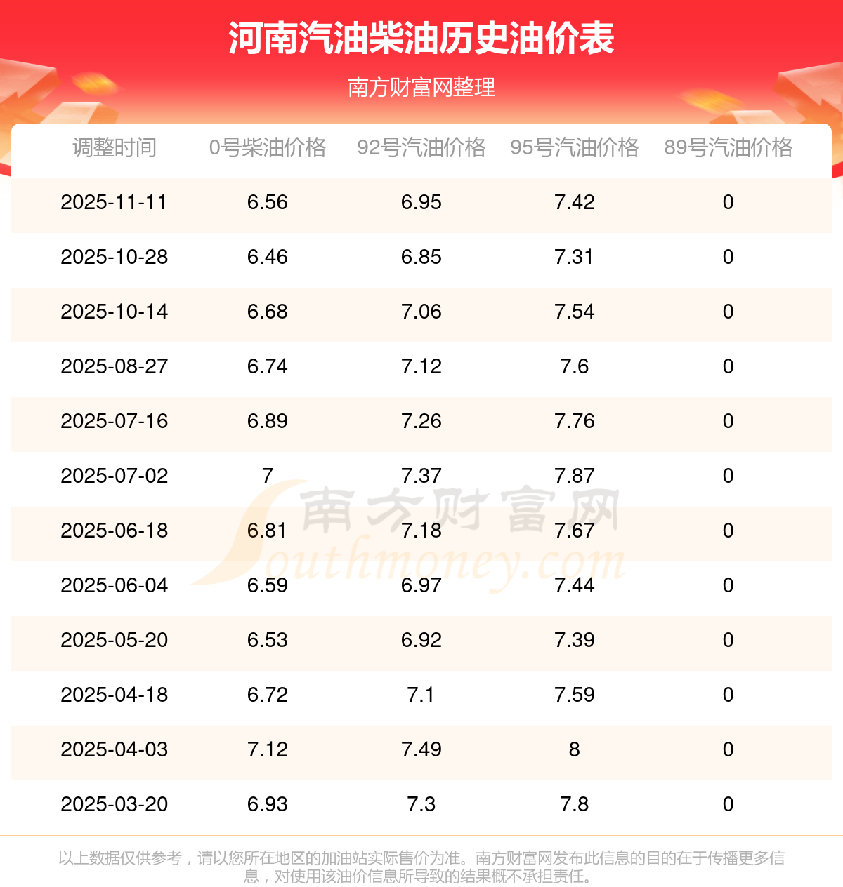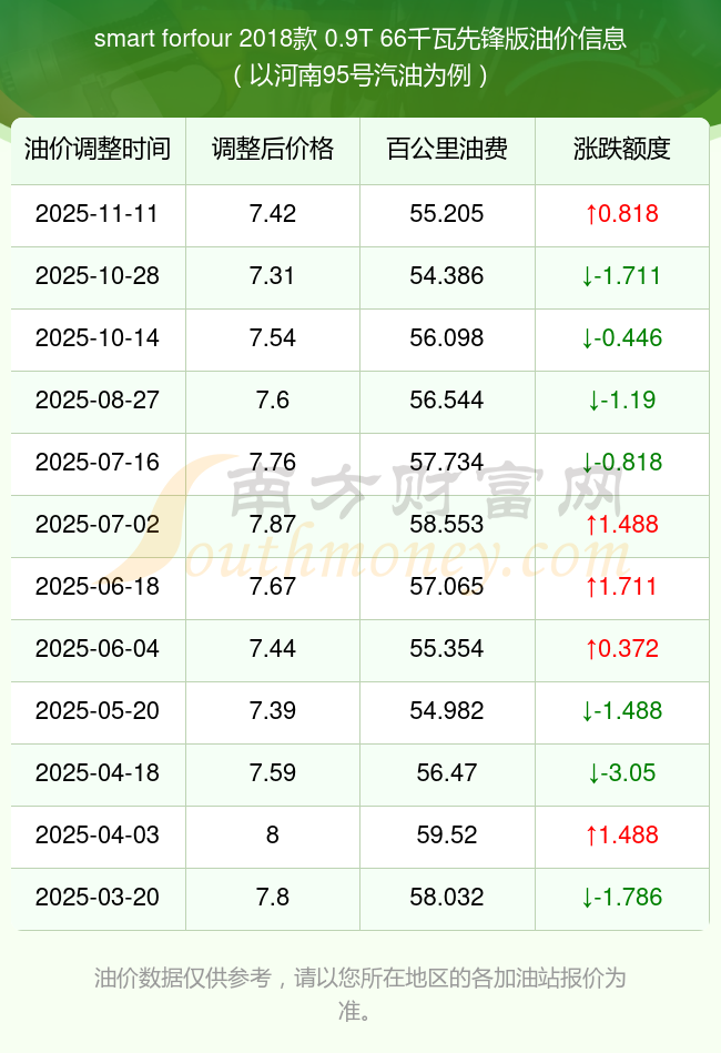 按11月11日95号汽油最新调整价格7.42元每升来计算(以河南为例),该车型百公里平均油费为55.205元,按上一轮10月28日调整价格7.31元每升来计算,百公里平均油费为54.386元,对比上一轮多花0.818元,下一轮油价调整时间为11月24日24时。