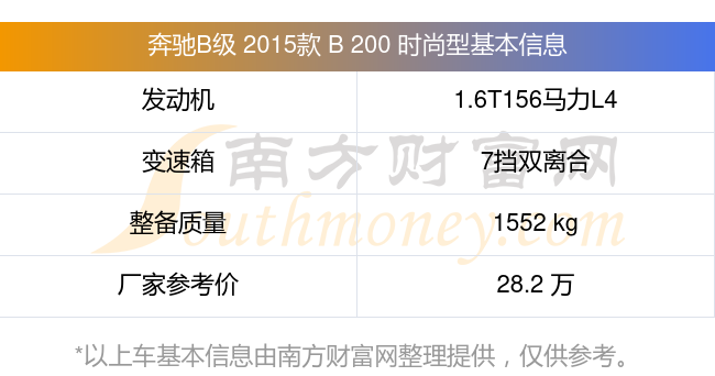 在动力方面,奔驰B级 2015款 B 200 时尚型搭载的是一台1.6T156马力L4涡轮增压发动机,匹配7挡双离合自动档变速箱,燃料形式为汽油,常规整备质量1552kg,厂家参考价28.2万元。