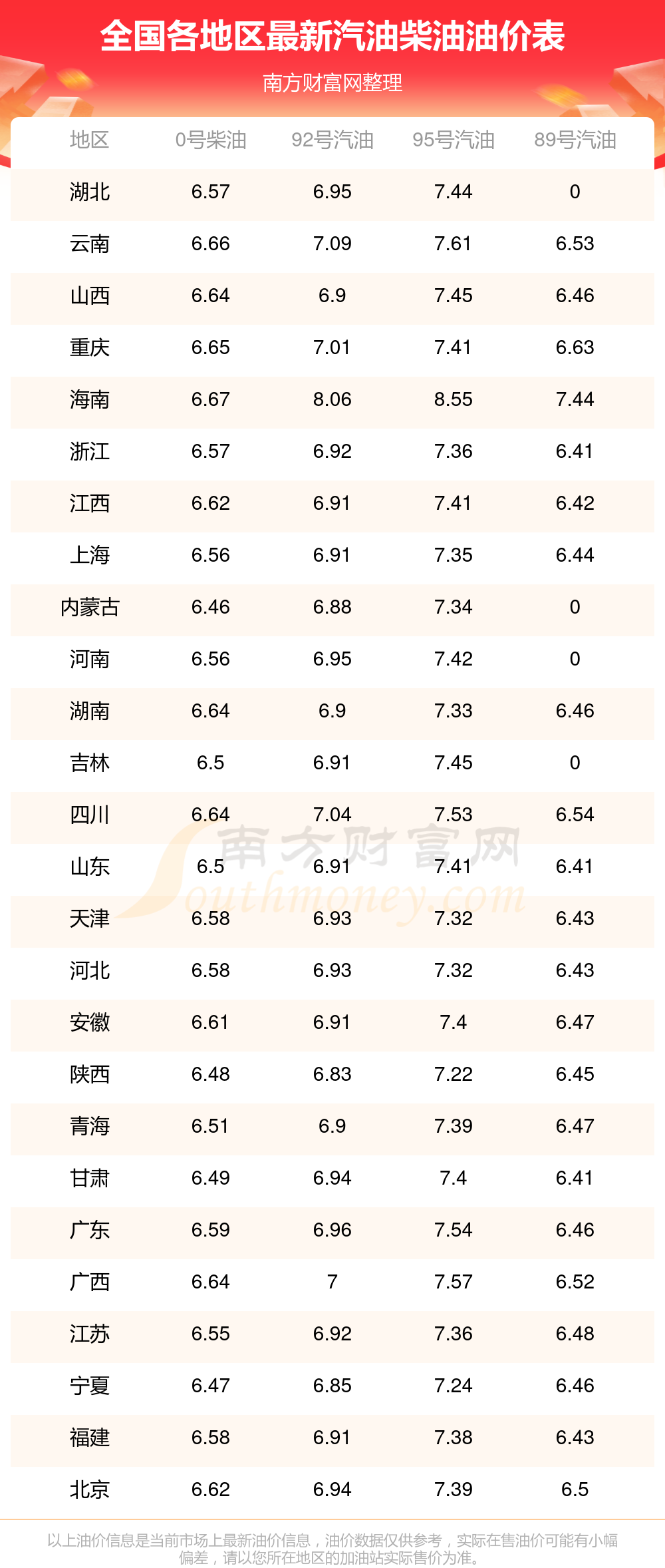 以上油价信息是当前市场上最新油价信息,油价数据仅供参考,实际在售油价可能有小幅偏差,请以您所在地区的加油站实际售价为准。
