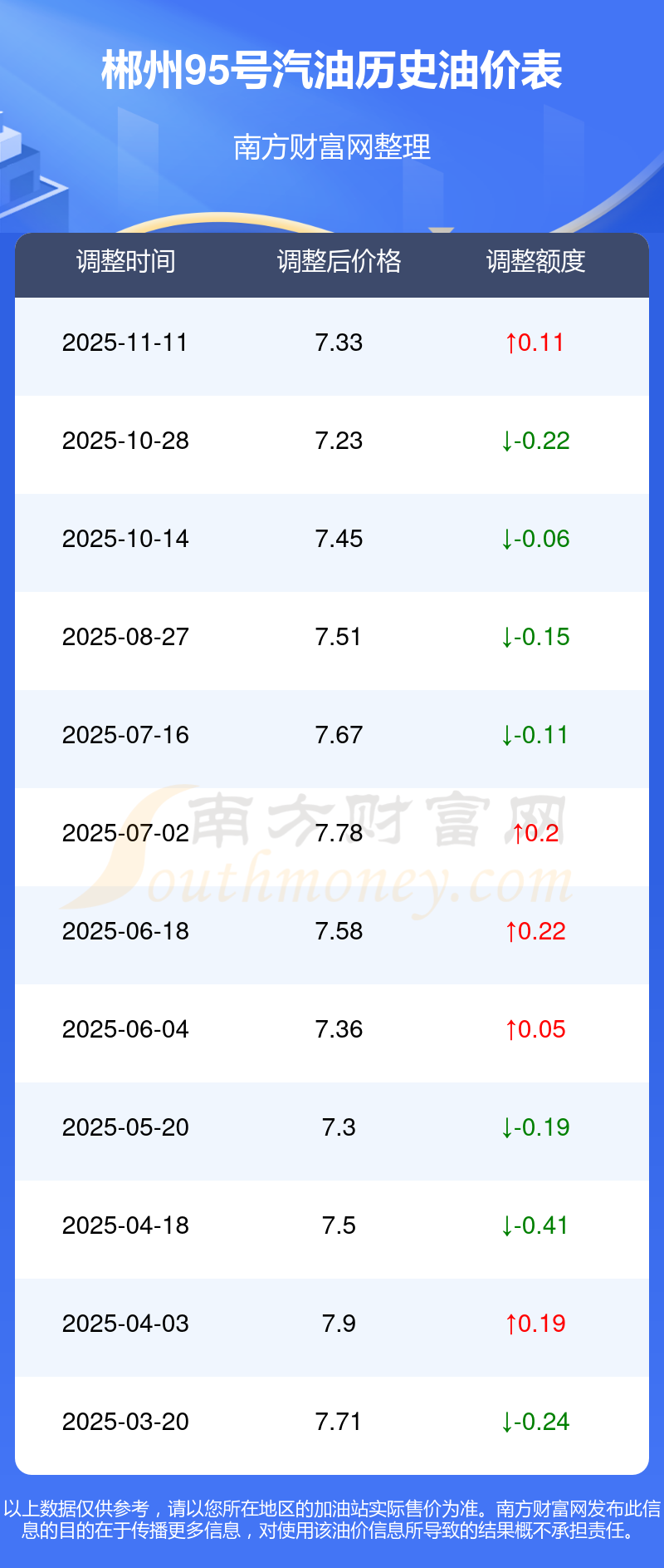 11月18日郴州汽油、柴油价格是多少钱一升?11月11日调整后,92号汽油为6.9元,上调了0.1元,上调幅达1.46%;95号汽油为7.33元,上调了0.11元,上调幅达1.46%;89号汽油为6.46元,上调了0.09元,上调幅达1.46%;0号柴油为6.64元,上调了0.1元,上调幅达1.58%。下一轮油价调整时间11月24日24时,距离现在还有6.63天。