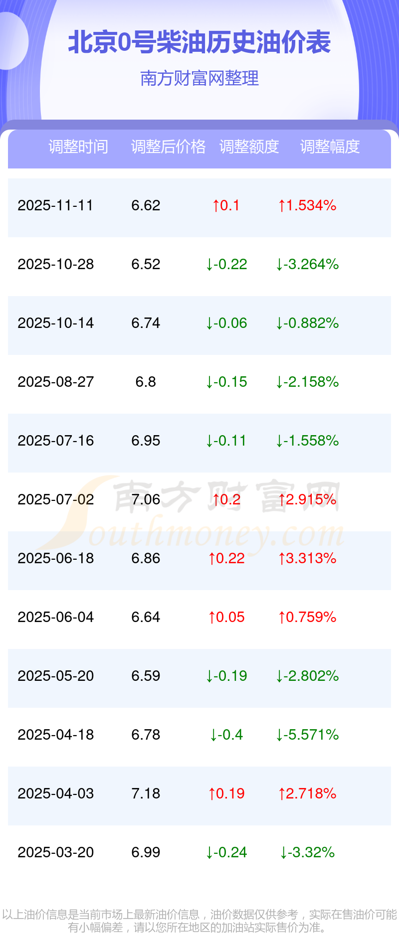 11月18日,北京0号柴油的价格是6.62元每升,本次的调整时间为11月11日,对比上次的调整涨了0.1元,涨1.534%,11月24日24时为下一轮油价调整时间,还有6.62天。