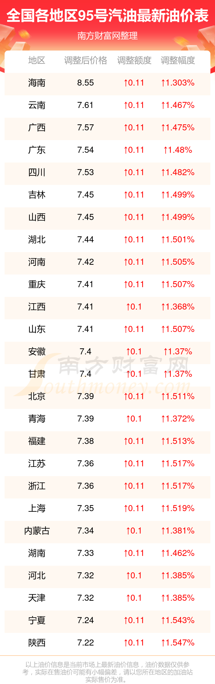 以上油价信息是当前市场上最新油价信息,油价数据仅供参考,实际在售油价可能有小幅偏差,请以您所在地区的加油站实际售价为准。
