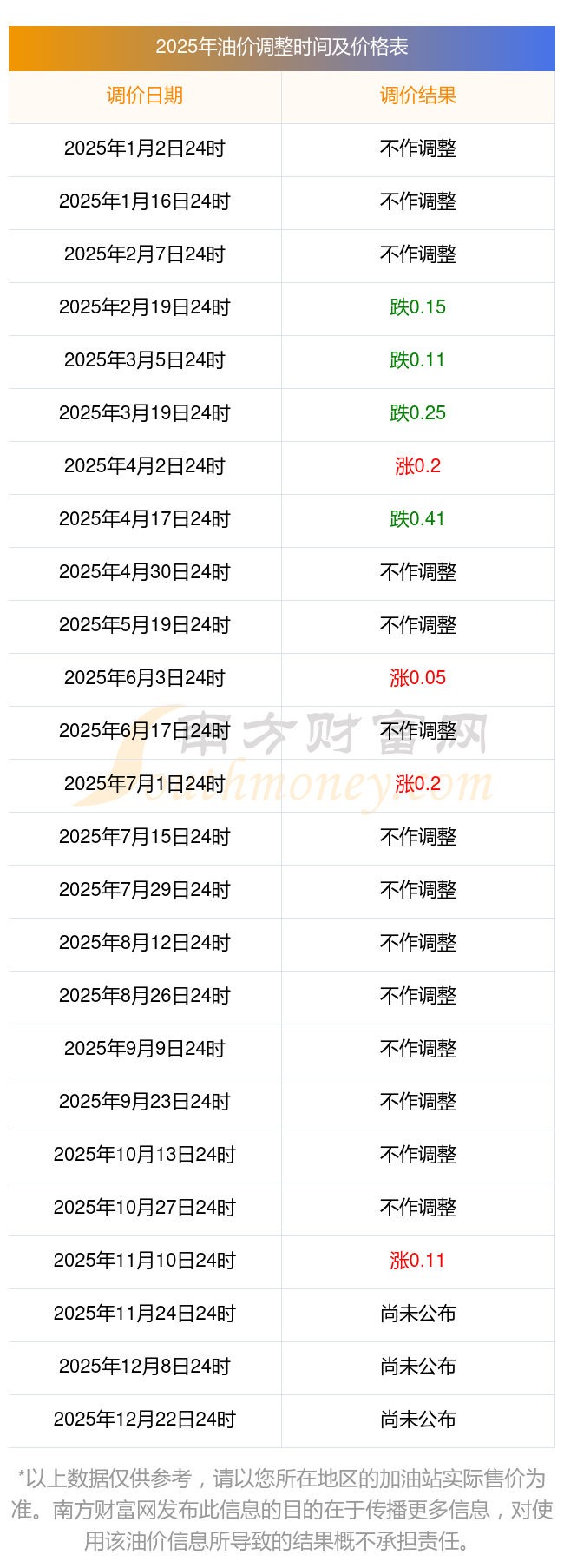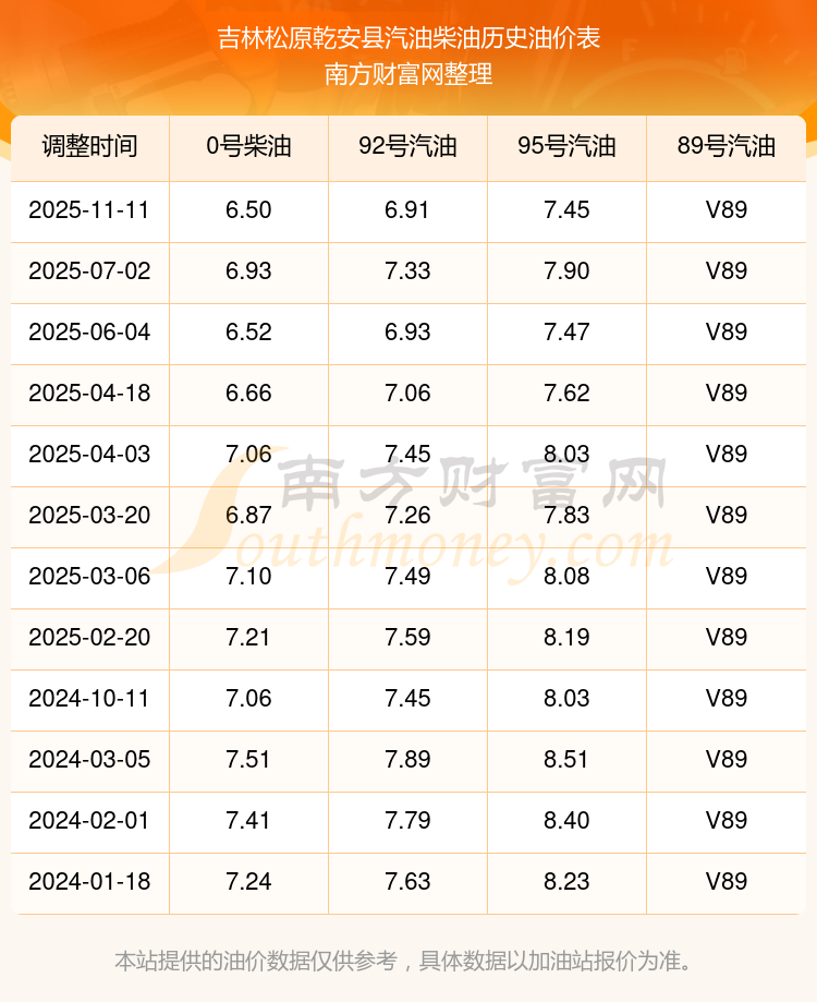 油价调整最新消息:下一轮油价调整时间11月24日24时。11月18日,吉林松原乾安县汽油、柴油每升最新价格为:92号汽油为6.91元,上升了0.11元;95号汽油为7.45元,上升了0.11元;0号柴油为6.5元,上升了0.1元,调整时间为11月11日。