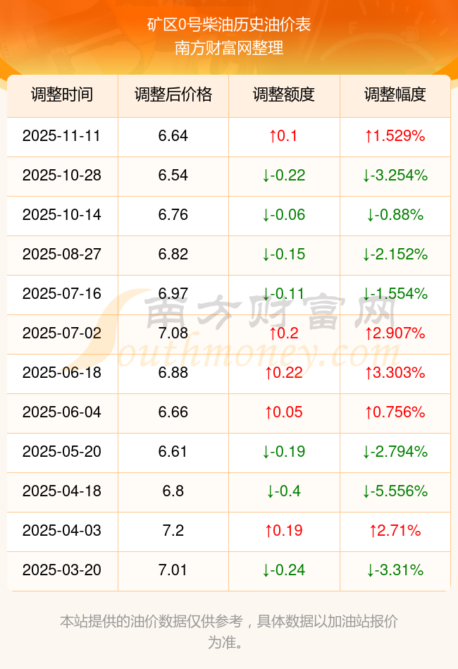 矿区0号柴油11月18日最新价格为6.64元/升,为11月11日油价调整后的价格,相对上次调整时间10月28日的油价6.54元每升,涨了0.1元,涨1.529%。