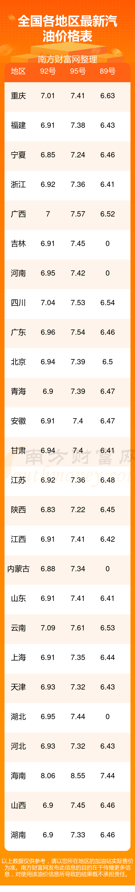 以上油价信息是当前市场上最新油价信息,油价数据仅供参考,实际在售油价可能有小幅偏差,请以您所在地区的加油站实际售价为准。
