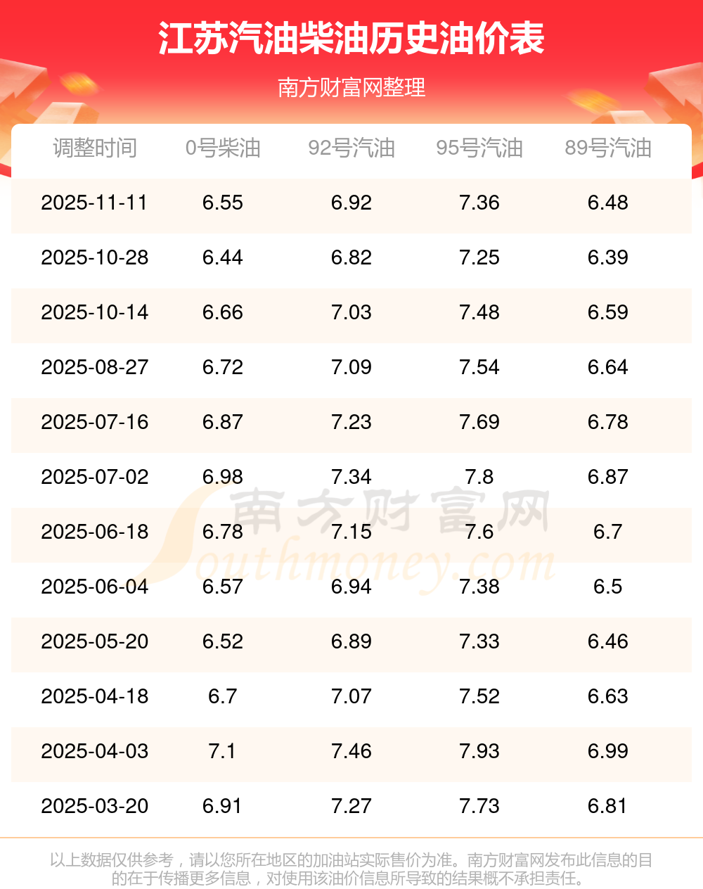 11月18日,江苏92号汽油的价格是6.92元每升,本次的调整时间为11月11日,对比上次的调整上调了0.1元,上调1.466%,下次调整时间为11月24日24时,还有6.59天。