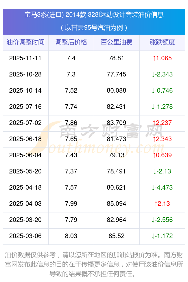 按照11月11日95号汽油最新调整价格7.4元/升来计算(以甘肃为例),该车型百公里平均油费为78.81元,按照上一轮10月28日调整价格7.3元/升来计算,百公里平均油费为77.745元,对比上一轮多花1.065元,下一轮油价调整时间为11月24日24时。