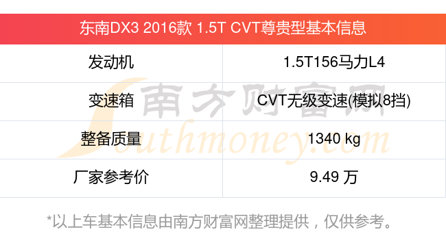 东南DX3 2016款 1.5T CVT尊贵型动力上搭载的是一台1.5T156马力L4涡轮增压发动机,匹配CVT无级变速(模拟8挡)自动档变速箱,燃料形式为汽油,常规整备质量1340kg,厂家参考价9.49万元。