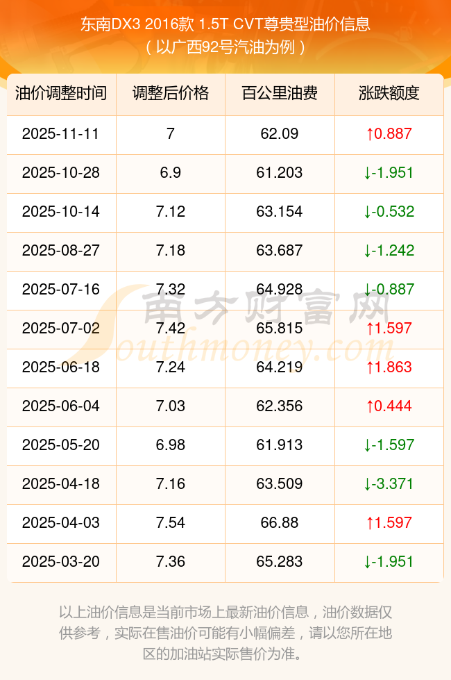 按照11月11日92号汽油最新调整价格7元/升来计算(以广西为例),该车型百公里平均油费为62.09元,按照上一轮10月28日调整价格6.9元/升来计算,百公里平均油费为61.203元,对比上一轮多花0.887元,下一轮油价调整时间为11月24日24时。
