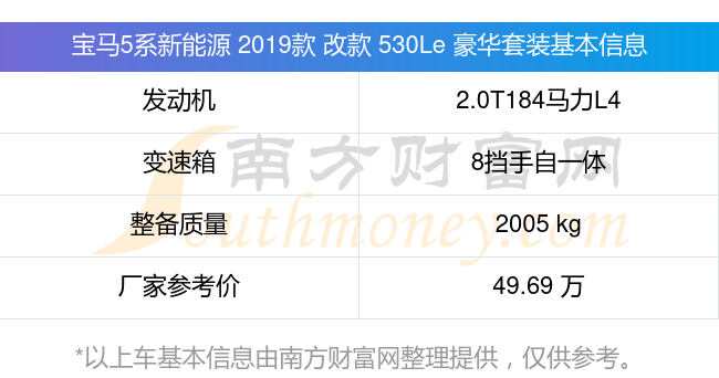 宝马5系新能源 2019款 改款 530Le 豪华套装搭载了一台2.0T184马力L4涡轮增压发动机,采用8挡手自一体自动档变速箱,常规整备质量2005kg,厂家参考价49.69万元。