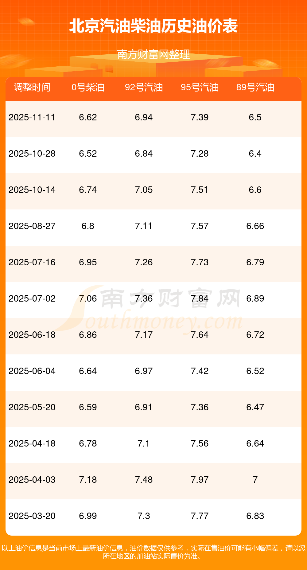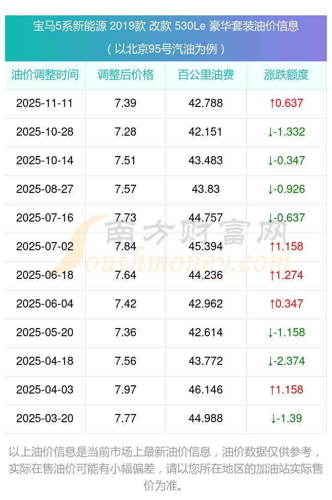 按11月11日95号汽油最新调整价格7.39元每升来计算(以北京为例),该车型百公里平均油费为42.788元,按上一轮10月28日调整价格7.28元每升来计算,百公里平均油费为42.151元,对比上一轮多花0.637元,下一轮油价调整时间为11月24日24时。