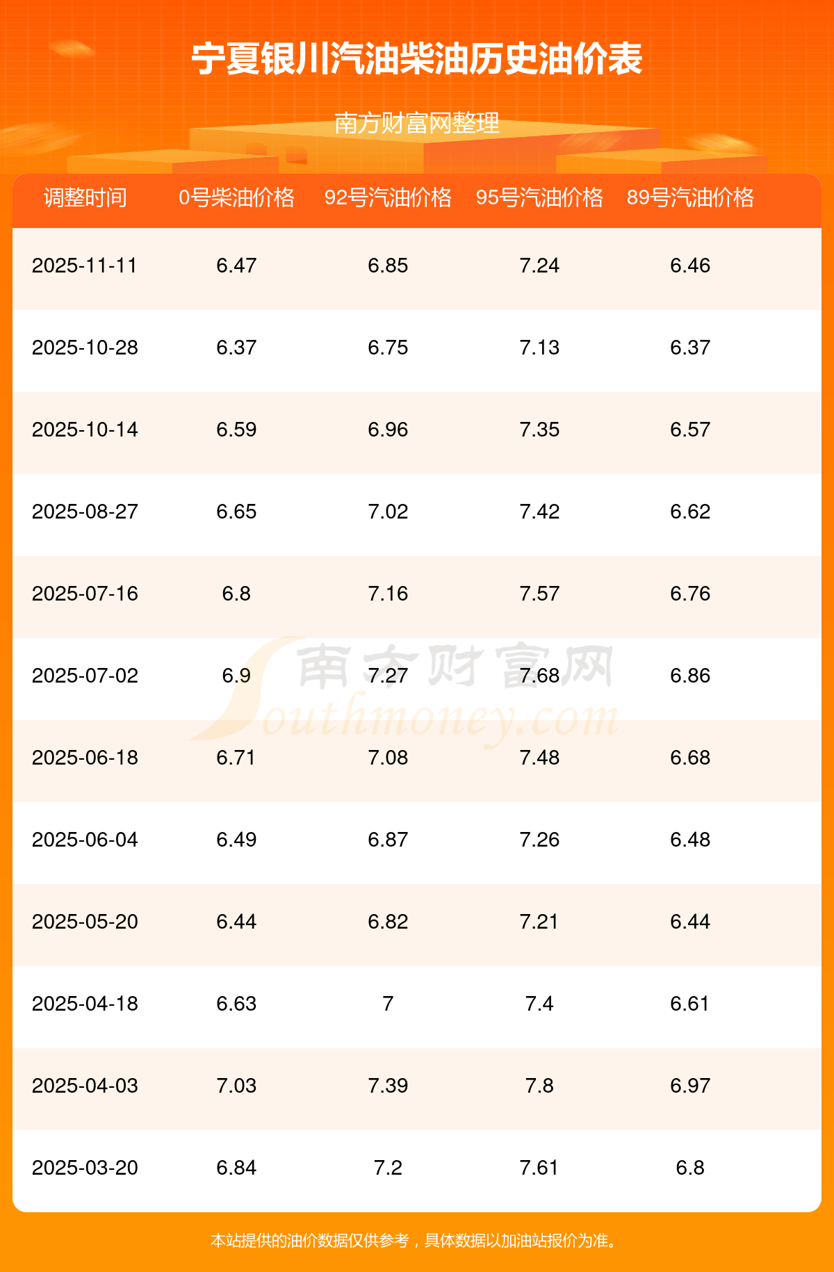 11月18日宁夏银川汽油、柴油每升价格:距离最近的油价调整时间是11月11日,92号汽油为6.85元,上调了0.1元,上调幅达1.48%;95号汽油为7.24元,上调了0.11元,上调幅达1.54%;89号汽油为6.46元,上调了0.09元,上调幅达1.41%;0号柴油为6.47元,上调了0.1元,上调幅达1.57%。