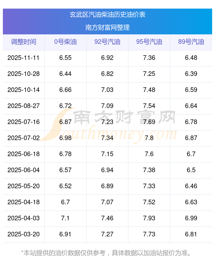 油价调整最新消息:下一轮油价调整时间11月24日24时。11月18日玄武区汽油、柴油每升的价格是11月11日调整后的价格:92号汽油为6.92元,上调了0.1元,上调幅达1.47%;95号汽油为7.36元,上调了0.11元,上调幅达1.52%;89号汽油为6.48元,上调了0.09元,上调幅达1.41%;0号柴油为6.55元,上调了0.11元,上调幅达1.71%。