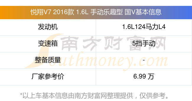 悦翔V7 2016款 1.6L 手动乐趣型 国V动力上配备的是一台1.6L124马力L4自然吸气发动机,匹配的是5挡手动挡变速箱,燃料形式为汽油,厂家参考价6.99万元。