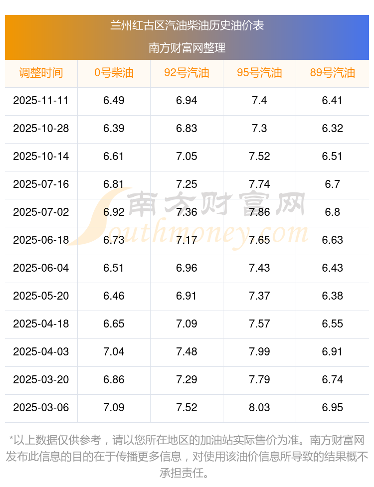 油价调整最新消息:下一轮油价调整时间11月24日24时。兰州红古区汽油柴油11月18日的价格每升多少钱?具体为:92号汽油为6.94元,升了0.11元;95号汽油为7.4元,升了0.1元;89号汽油为6.41元,升了0.09元;0号柴油为6.49元,升了0.1元,本轮油价的调整时间为11月11日。