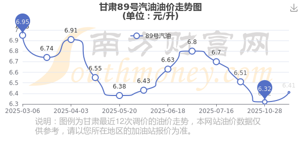 11月18日,甘肃汽油、柴油的价格为11月11日调整后的价格。具体为:92号汽油6.94元,上调了0.11元;95号汽油7.4元,上调了0.1元;89号汽油6.41元,上调了0.09;0号柴油6.49元,上调了0.1元。