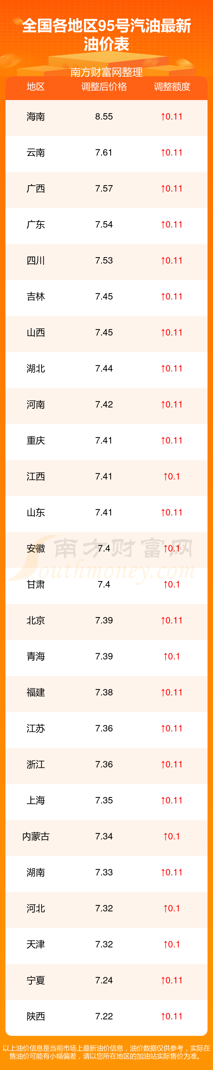 全国95号汽油平均价格为:7元每升,其中,最低为陕西,价格7.22元/升,最高为海南,价格8.55元/升。