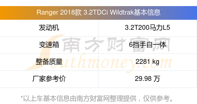 Ranger 2018款 3.2TDCi Wildtrak动力方面,搭载的是一台3.2T200马力L5涡轮增压发动机,匹配6挡手自一体自动档变速箱,燃料形式为柴油,常规整备质量2281kg,厂家参考价29.98万元。