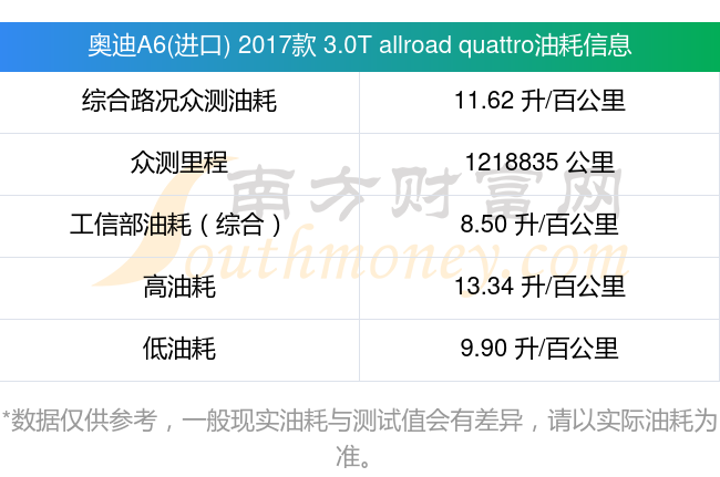 根据多位车主实测得出数据,该车型低油耗为9.90升每百公里,高油耗为13.34升每百公里,综合路况众测油耗为11.62升每百公里,工信部综合油耗为8.50升每百公里。