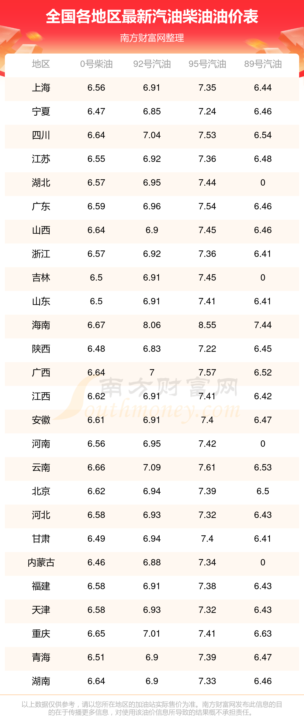 油价调整最新消息:本次油价的调整时间为11月11日,调整后全国油价详情为:92号汽油平均价格为7元每升,其中,最低的是陕西,6.83元每升,最高的是海南,8.06元每升。95号汽油平均价格为7元每升,其中,最低的是陕西,7.22元每升,最高的是海南,8.55元每升。0号柴油平均价格为:7元每升,其中,最低的是内蒙古,6.46元每升,最高的是海南,6.67元每升。89号汽油平均价格为7元每升,其中,最低的是浙江,6.41元每升,最高的是海南,7.44元每升。下一轮汽油价格调整时间11月24日24时,距离现在还有6.5天。