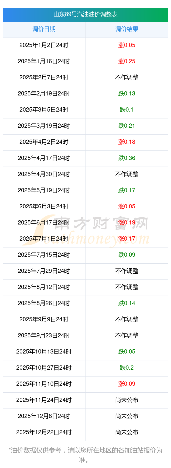 11月18日,济南汽油、柴油每升最新价格为(11月11日调整后的价格):92号汽油为6.91元,上调了0.1元,上调幅达1.47%;95号汽油为7.41元,上调了0.11元,上调幅达1.51%;89号汽油为6.41元,上调了0.09元,上调幅达1.42%;0号柴油为6.5元,上调了0.1元,上调幅达1.56%。下一轮油价调整时间11月24日24时,距离现在还有6.5天。