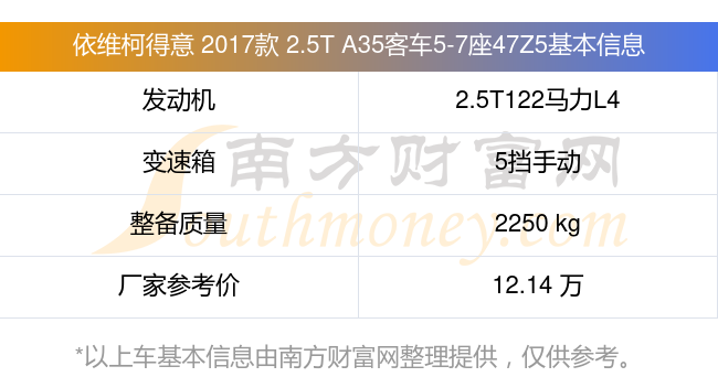 在动力上,依维柯得意 2017款 2.5T A35客车5-7座47Z5配备的是一台2.5T122马力L4涡轮增压发动机,匹配的是5挡手动挡变速箱,燃料形式为柴油,常规整备质量2250kg,厂家参考价12.14万元。