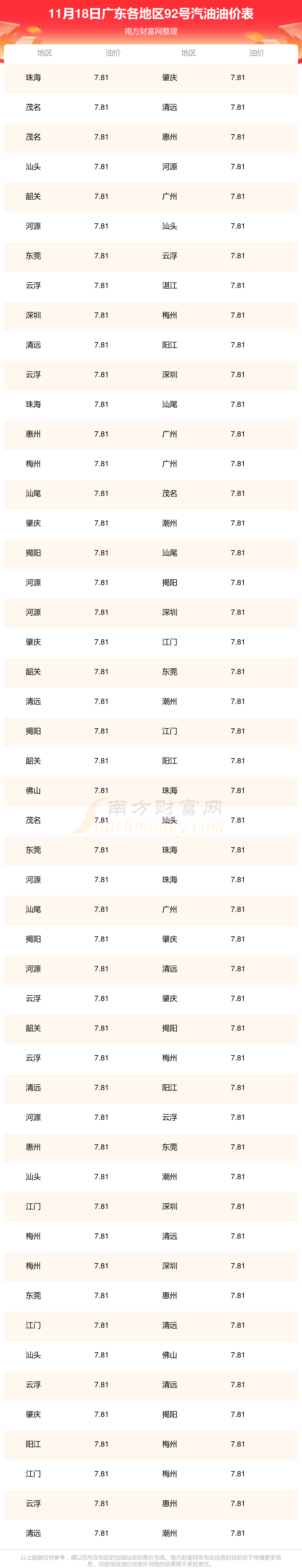 11月18日,广东92号汽油的价格是6.96元每升,本次的调整时间为11月11日,对比上次的调整增了0.1元,增1.458%,11月24日24时为下一轮油价调整时间,还有6.49天。
