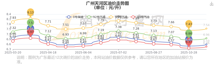 广州天河区汽油、柴油11月18日每升的价格为:92号汽油6.96元;95号汽油7.54元;89号汽油6.46元;0号柴油6.59元,本次油价调整时间是11月11日。