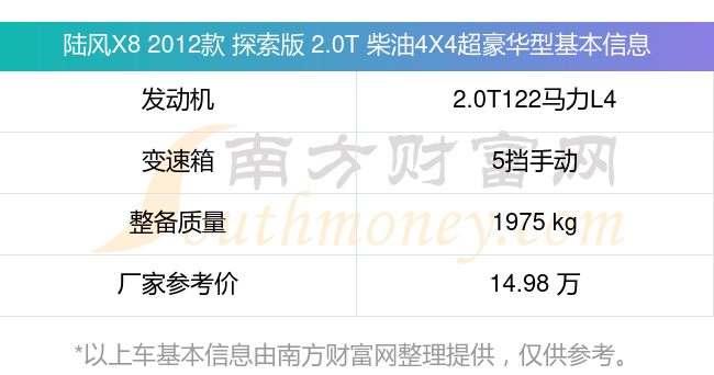 陆风X8 2012款 探索版 2.0T 柴油4X4超豪华型动力方面,搭载的是一台2.0T122马力L4涡轮增压发动机,匹配5挡手动挡变速箱,燃料形式为柴油,常规整备质量1975kg,厂家参考价14.98万元。
