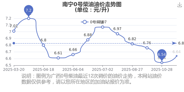 油价调整最新消息:南宁汽油、柴油11月18日每升的价格为11月11日调整后的价格,具体油价为:92号汽油7元;95号汽油7.57元;89号汽油6.52元;0号柴油6.64元。南宁下一轮油价调整时间11月24日24时,距离现在还有6.46天。