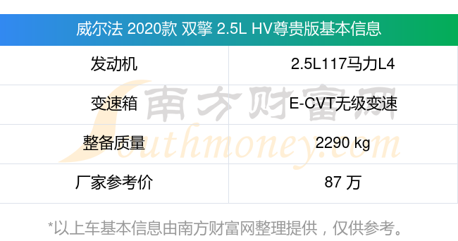 威尔法 2020款 双擎 2.5L HV尊贵版搭载了一台2.5L117马力L4自然吸气发动机,采用E-CVT无级变速自动档变速箱,常规整备质量2290kg,厂家参考价87万元。