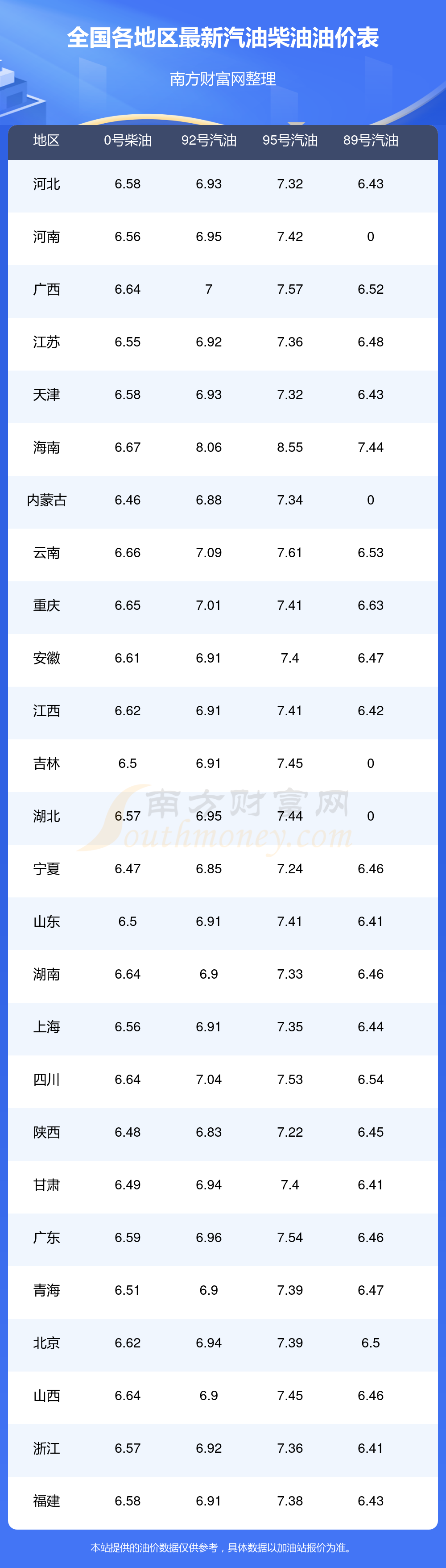 0号柴油平均价格:7元每升,其中,最高为海南,价格为6.67元/升,最低为内蒙古,价格为6.46元/升。