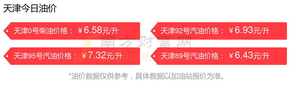 11月18日天津汽油柴油每升价格(11月11日调整后的价格):92号汽油为6.93元,上升了0.1元,上升幅达1.46%;95号汽油为7.32元,上升了0.1元,上升幅达1.39%;89号汽油为6.43元,上升了0.1元,上升幅达1.58%;0号柴油为6.58元,上升了0.11元,上升幅达1.7%。天津下一轮油价调整时间11月24日24时,距离现在还有6.45天。