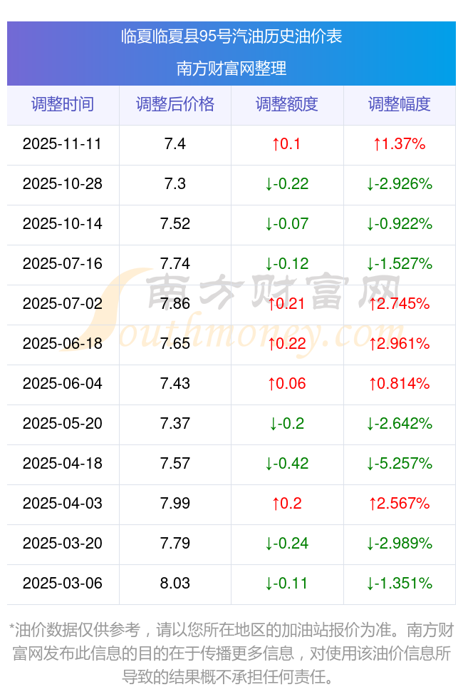 临夏临夏县11月18日95号汽油历史油价调整一览表