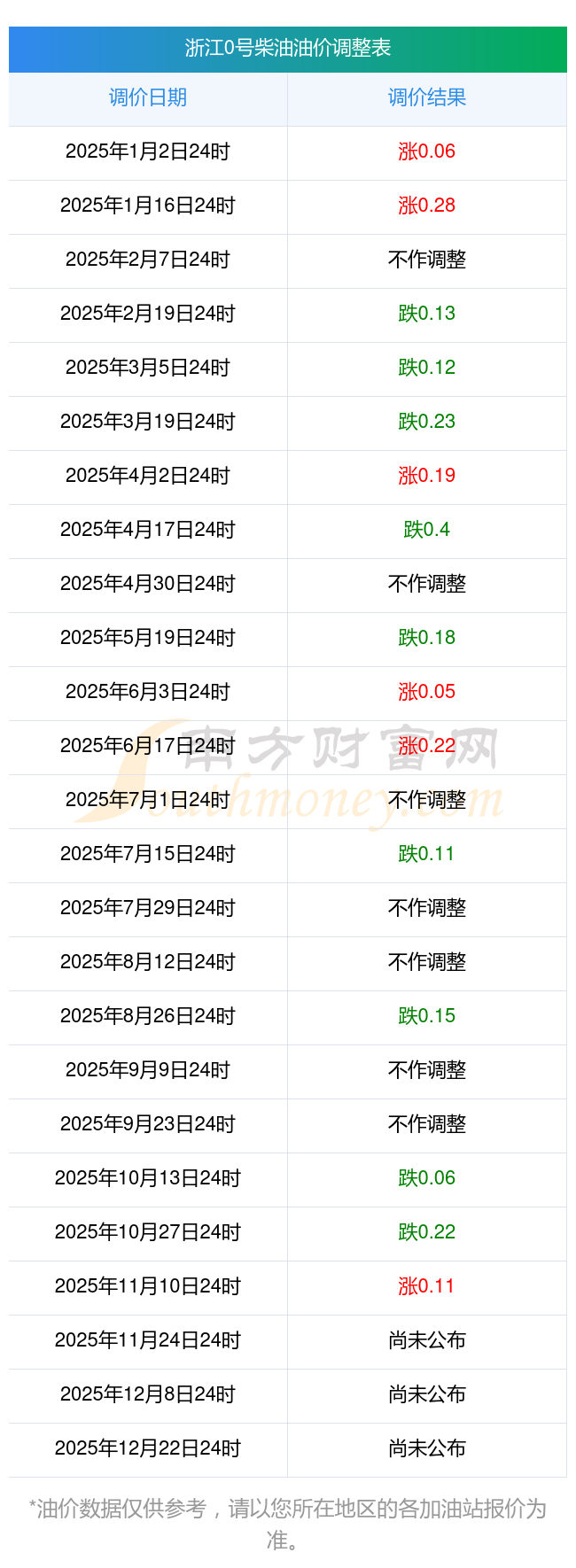 11月18日,浙江0号柴油的价格是6.57元每升,本次的调整时间为11月11日,对比上次的调整升了0.11元,升1.703%,下次调整时间为11月24日24时,还有6.43天。