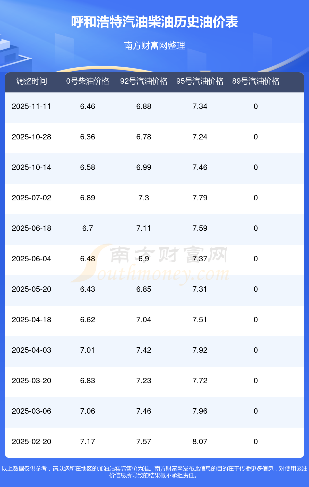 11月18日呼和浩特汽油、柴油每升的价格是多少?详情如下:95号汽油为7.34元,增了0.1元;92号汽油为6.88元,增了0.1元;0号柴油为6.46元,增了0.1元,调整时间为11月11日。