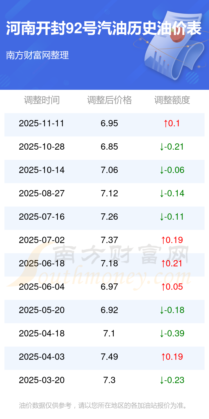 河南开封92号汽油11月18日价格查询:11月11日油价调整后,河南开封92号汽油6.95元/升,相对上次调整时间10月28日的油价6.85元每升,上升了0.1元,上升1.46%。下一轮油价调整时间11月24日24时,距离现在还有6.42天。